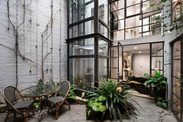 A multi-level warehouse-style apartment in South Yarra, designed by architect Daryl Jackson, thoughtfully integrated the glass-sided lift into the fabric of the building.Credit: Abercrombys