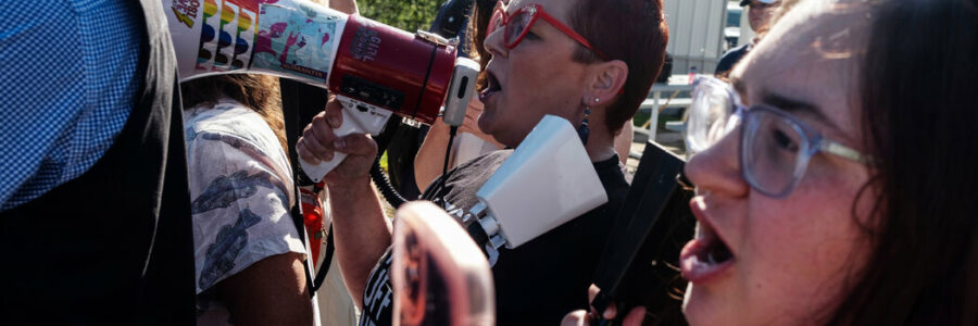At one point, a minor fracas ensued between one of the women and a man who was there to welcome DeSantis. Handlers for the governor and local law enforcement stepped in between them. The governor’s remarks were mostly muffled by the chants, and his aides quickly escorted journalists away from the scene to an awaiting travel van.
