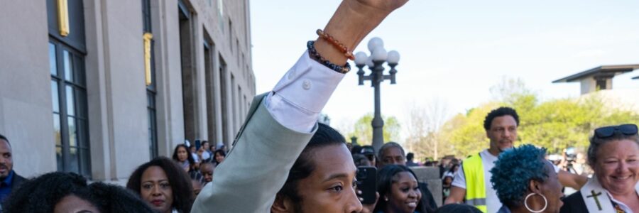 State Rep. Justin Jones raises his fist after being reinstated to his seat on April 10 in Nashville, Tennessee. Photo: Seth Herald/Getty Images
